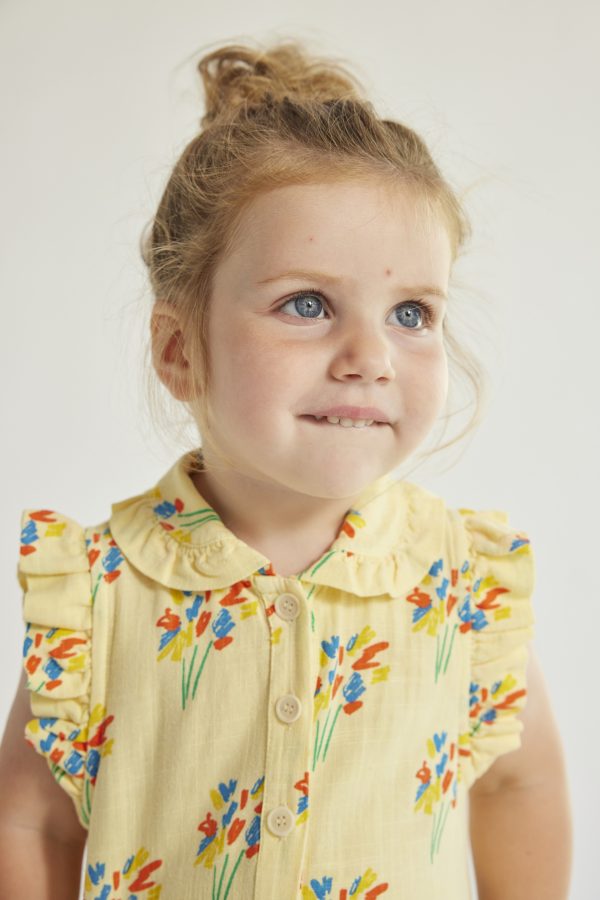 Made from 100% BCI cotton, this light yellow playsuit features a sleeveless design, round neckline, front buttons, and crotch snaps for easy changing. Soft, breathable, and perfect for warm days.