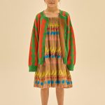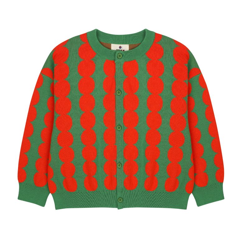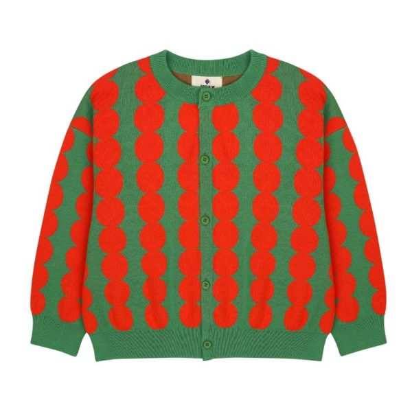 This Jellymallow Bongbong Knit Cardigan in vibrant green and orange adds a fun splash of color to any outfit.