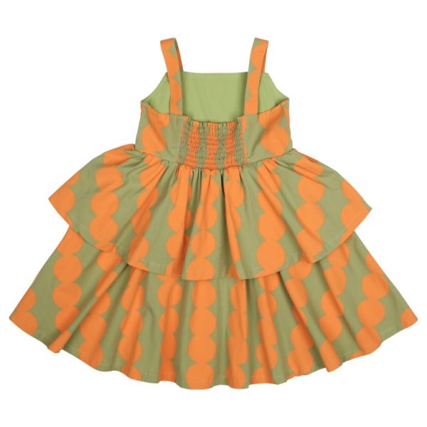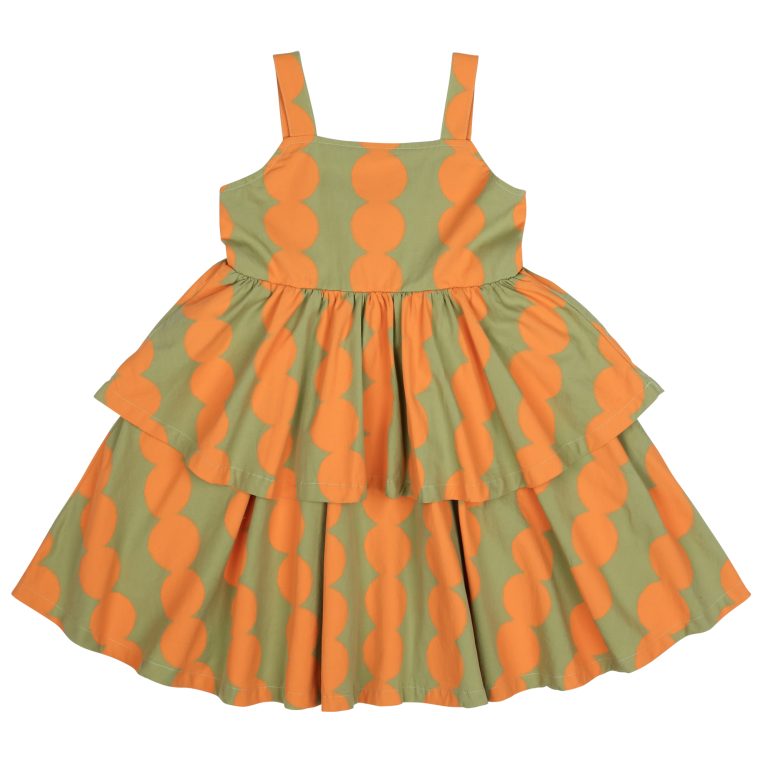 The Bongbong Tiered Dress is a bright and cheerful piece with bold orange waves on a green background.