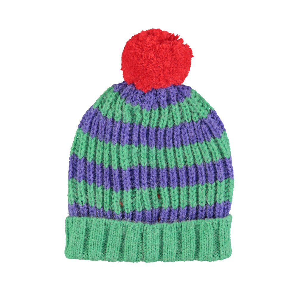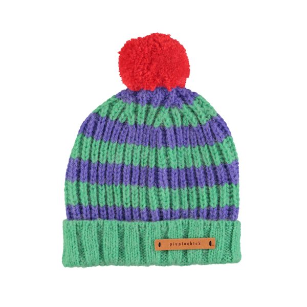 Knitted Hat W/ Pompon Green & Purple Stripes