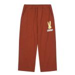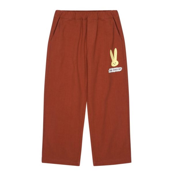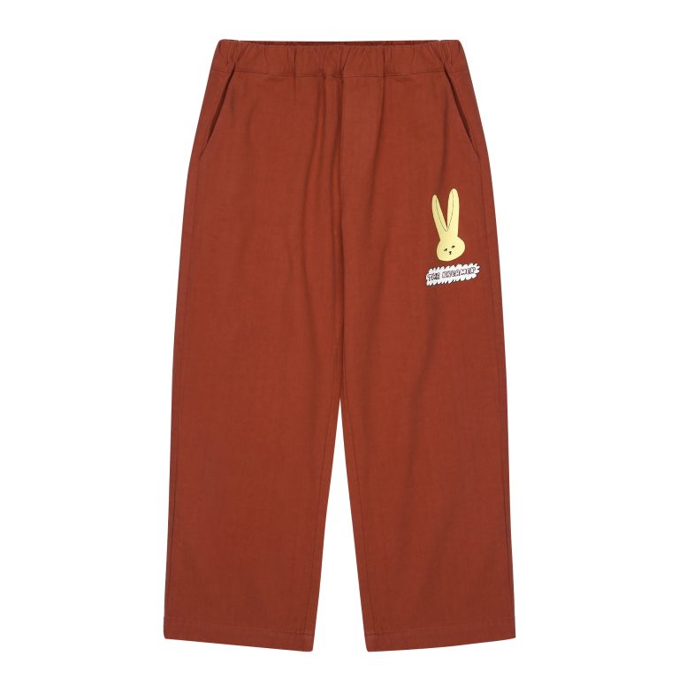 Jellymallow brown trousers made from 100% cotton, featuring a playful neon rabbit print that adds a fun twist to any outfit.